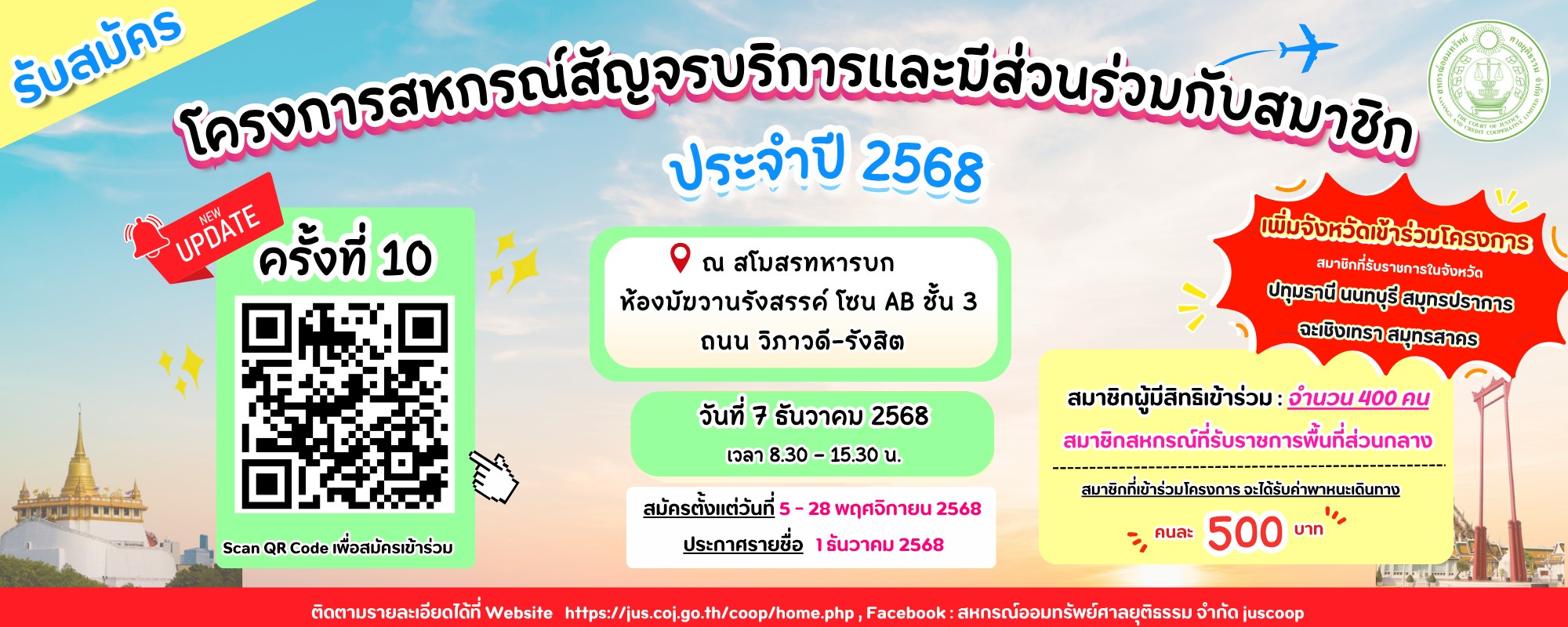 โครงการสหกรณ์สัญจรบริการและมีส่วนร่วมกับสมาชิก ประจำปี 2568 ❮ ❯ ประกาศเกี่ยวกับ "โครงการสหกรณ์สัญจรบริการและมีส่วนร่วมกับสมาชิก ประจำปี 2568" - รายชื่อสมาชิกเข้าร่วมโครงการสหกรณ์สัญจรบริการและมีส่วนร่วมกับสมาชิก ประจำปี 2568 ครั้งที่ 10/2568 (ส่วนกลาง) ภาพกิจกรรม ครั้งที่1 ครั้งที่2 ครั้งที่3 ครั้งที่4 ครั้งที่5 ครั้งที่6 ครั้งที่7 ครั้งที่8 ครั้งที่9 ครั้งที่10 สงขลา ( 21 มิถุนายน 2568 ) ดูภาพทั้งหมด สุราษฎร์ธานี ( 19 กรกฎาคม 2568 ) ดูภาพทั้งหมด สระบุรี ( 16 สิงหาคม 2568 ) ดูภาพทั้งหมด ระยอง ( 23 สิงหาคม 2568 ) ดูภาพทั้งหมด นครราชสีมา ( 13 กันยายน 2568 ) ดูภาพทั้งหมด อุดรธานี ( 20 กันยายน 2568 ) ดูภาพทั้งหมด นครปฐม ( 18 ตุลาคม 2568 ) ดูภาพทั้งหมด พิษณุโลก ( 25 ตุลาคม 2568 ) ดูภาพทั้งหมด เชียงใหม่ ( 8 พฤศจิกายน 2568 ) ดูภาพทั้งหมด กรุงเทพมหานคร ( 22 พฤศจิกายน 2568 ) ดูภาพทั้งหมด